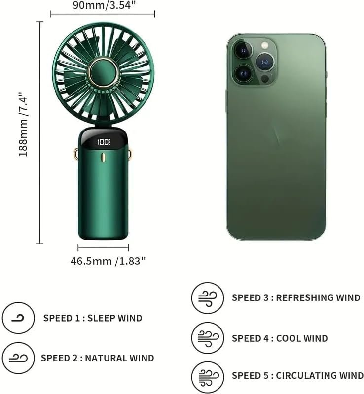 Portable and Lightweight Design: This handheld fan features an ultra-lightweight design, compact enough to fit in your pocket or bag with ease. Perfect for commuting, travel, or outdoor activities, it ensures you stay cool wherever you go.Long-Lasting Battery Life: Equipped with an energy-efficient battery, it supports up to 8-20 hours of continuous use, keeping you cool all day long. Whether you're camping, traveling, or working indoors, you won't have to worry about frequent recharging.3-in-1 Versatile Functionality: It can be used as a handheld fan, neck fan, or desk fan. The foldable stand allows it to transform into a desk fan, while the 90° adjustable design makes it a comfortable neck fan, adapting to various cooling needs in different scenarios.Powerful Airflow with Adjustable Speeds: Powered by a high-performance brushless motor and optimized aerodynamics, it delivers strong airflow. With 5 adjustable speed settings, you can easily customize the wind intensity for work, sleep, or relaxation.Smart Digital Display and Quiet Operation: The built-in smart display shows real-time battery life and speed levels, keeping you informed at all times. Additionally, the fan operates quietly, reducing noise by 30% compared to similar models, ensuring a peaceful environment for work or sleep.