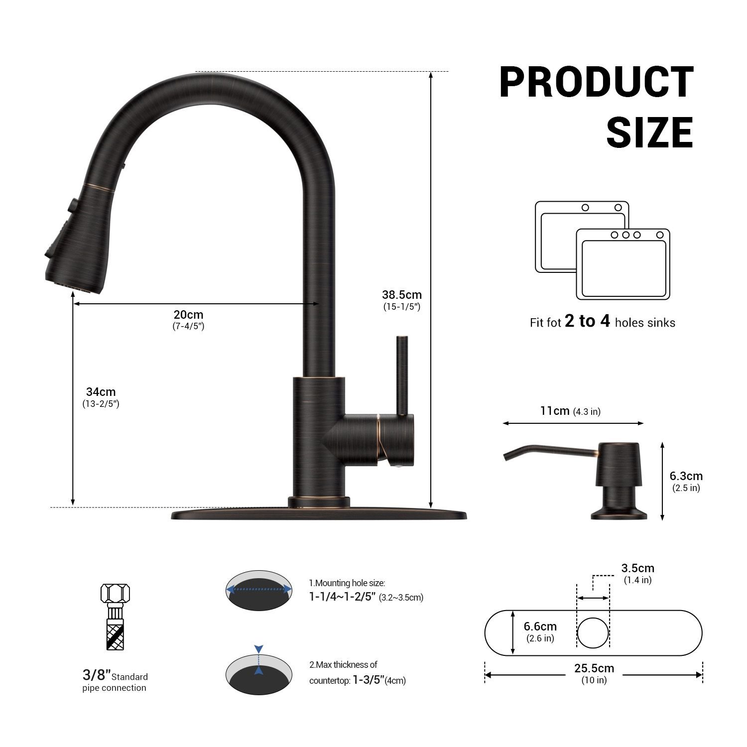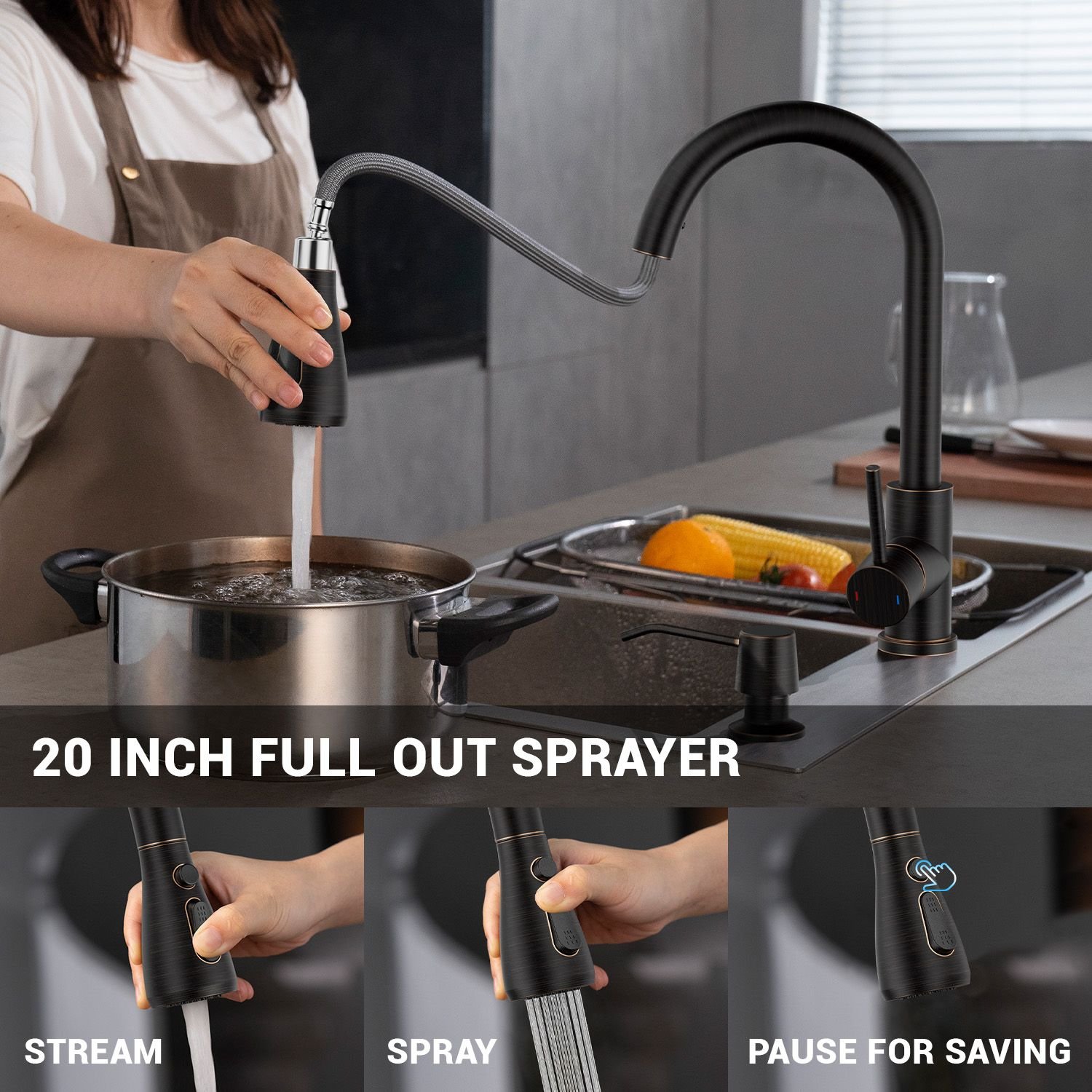 1.The Best Kitchen Partner: Faucet and soap dispenser with an 20” pull out hose, can reach even deep corner for cleaning. 360°rotation swivel nozzle offers full range washing access, bringing more convenience during your everyday kitchen tasks