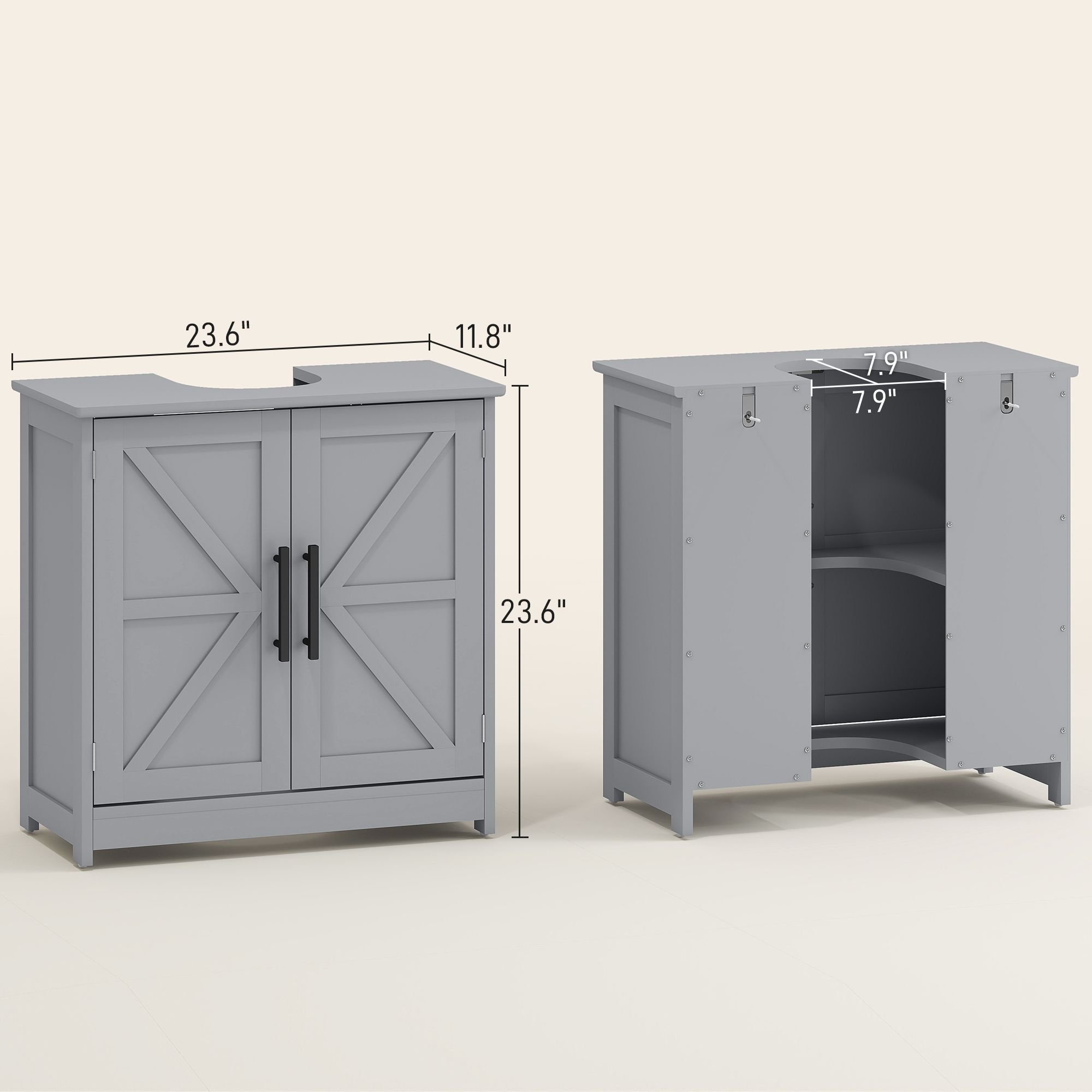 1.- Farmhouse Charm: This under sink cabinet brings cozy, rustic vibes to your bathroom. The charming barn doors and stylish black metal handles create a warm look that perfectly blends farmhouse elegance with everyday functionality