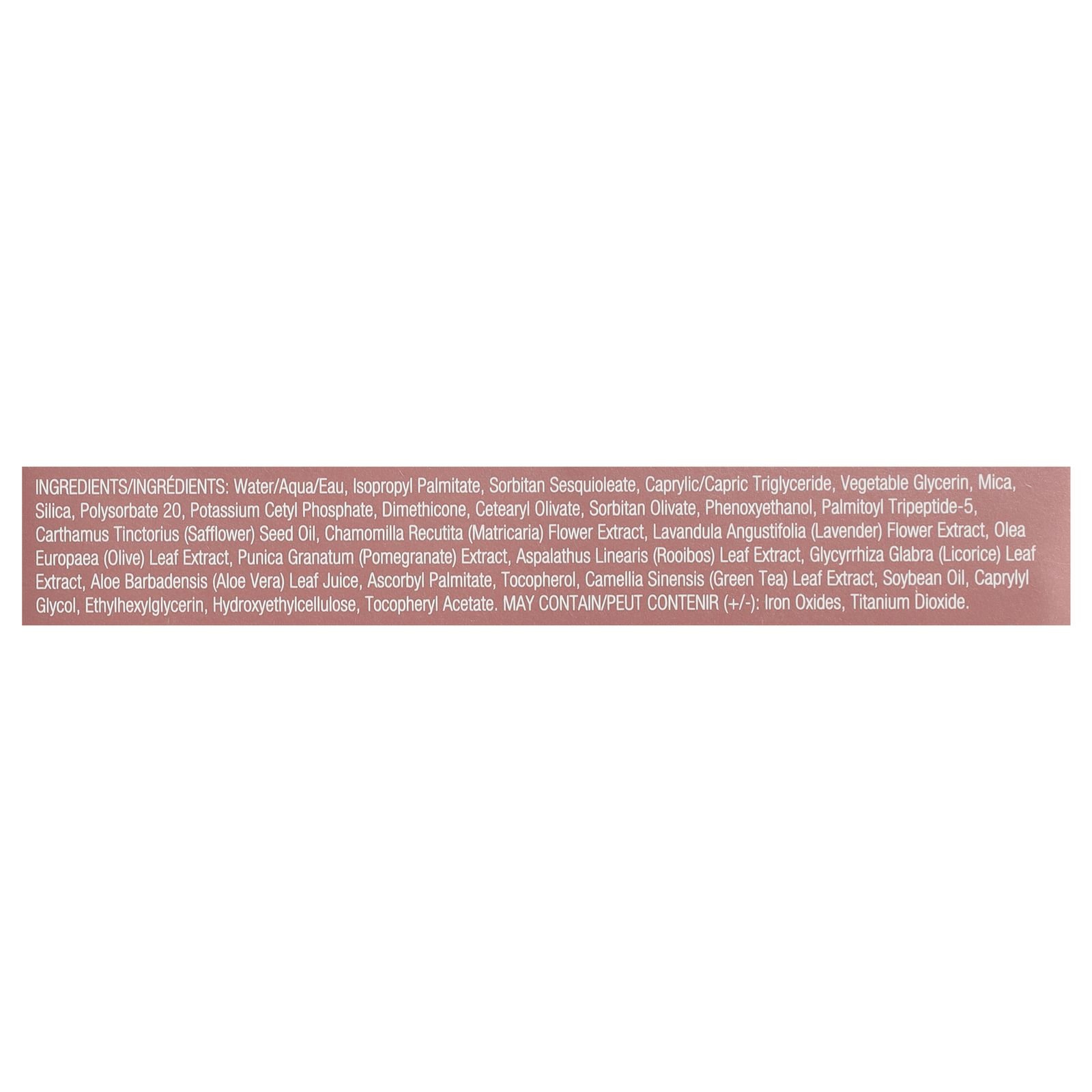 ingredients : water/aqua/eau;isopropyl palmitate;sorbitan sesquioleate;caprylic/capric triglyceride;vegetable glycerin;mica;silica;polysorbate 20;potassium cetyl phosphate;dimethicone;cetearyl olivate;sorbitan olivate;phenoxyethanol;palmitoyl tripeptide-5;carthamus tinctorius (safflower) seed oil;chamomilla recutita (matricaria) flower extract;lavandula angustifolia (lavender) flower extract;olea europaea (olive) leaf extract;punica granatum (pomegranate) extract;aspalathus linearis (rooibos) leaf extract;gly