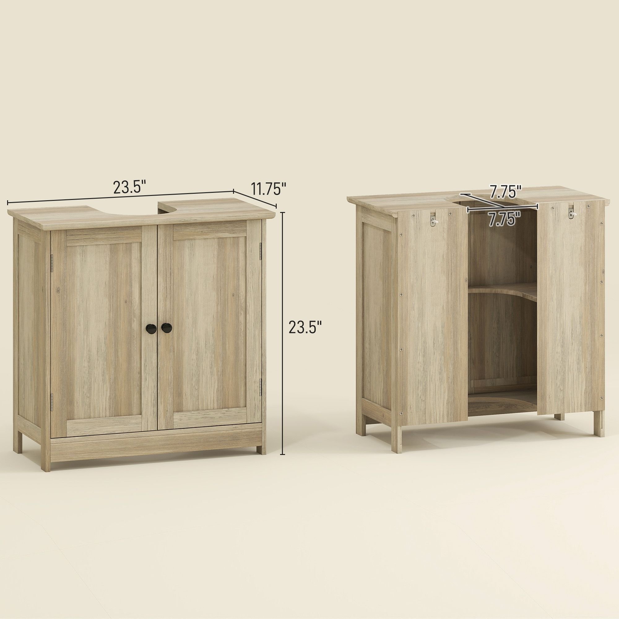 1.- Space Saving: This bathroom sink cabinet is designed to sit under your open sink with a U-shaped design to maximize storage space. U-shape opening slot size: 8.75"L x 7.5"W. Suitable for pedestal or wall-mounted sinks.