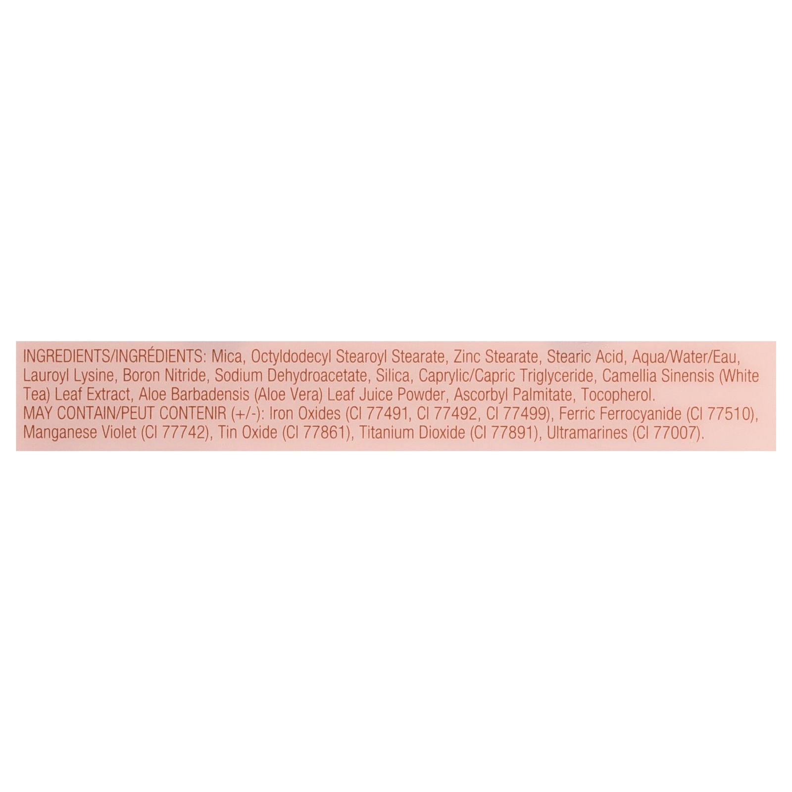 ingredients : mica;octyldodecyl stearoyl stearate;zinc stearate;stearic acid;aqua/water/eau;lauroyl lysine;boron nitride;sodium dehydroacetate;silica;caprylic/capric triglyceride;camellia sinensis (white tea) leaf extract;aloe barbadensis (aloe vera) leaf juice powder;ascorbyl palmitate;tocopherol