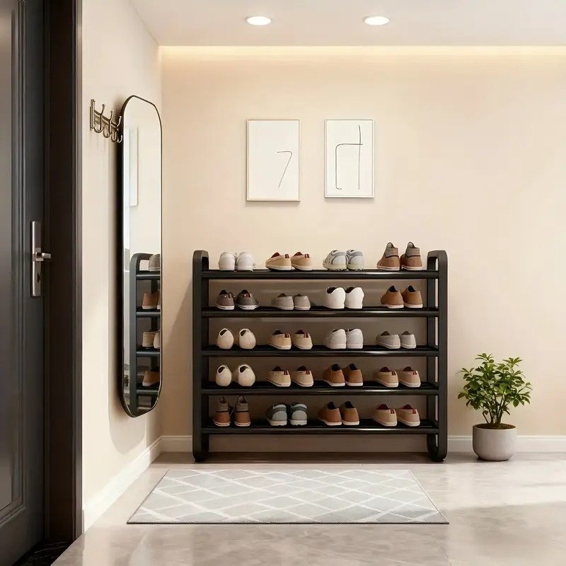 Maximize your space with this 5-Tier Metal and Plastic Shoe Rack Organizer, designed for modern, compact living. Its narrow vertical design fits perfectly in small spaces like dorms, apartments, and entryways while offering generous storage capacity.