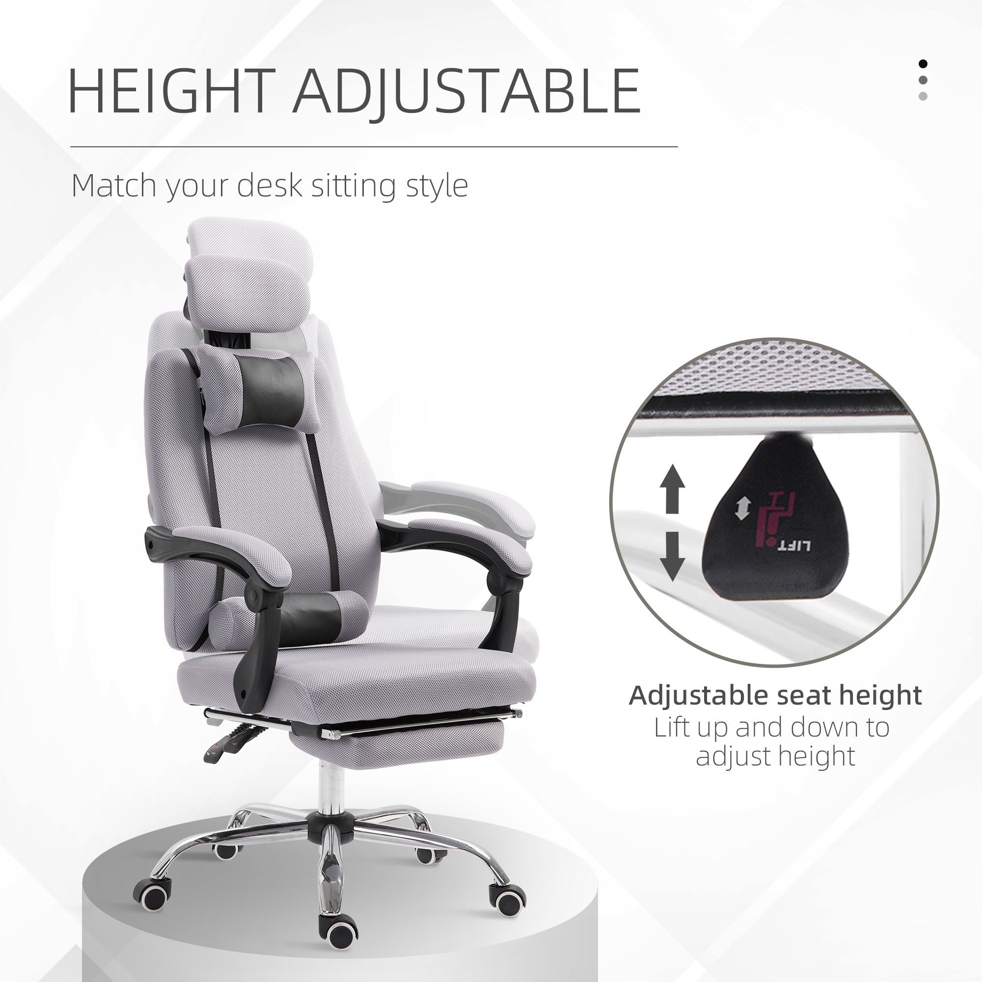 Comfortable and multifunctional office chairs are truly indispensable. Ergonomic high air permeability fabric cover, curved and adjustable backrest, and extended footrest enable you to enjoy a comfortable experience for a long period of time. The swivel chair's head and lumbar pillows are made of fabric, offering the breathable mesh chair a sleek and stylish look. Robust 5-star PU casters allow you to move smoothly. Let this swivel chair improve your quality of life.