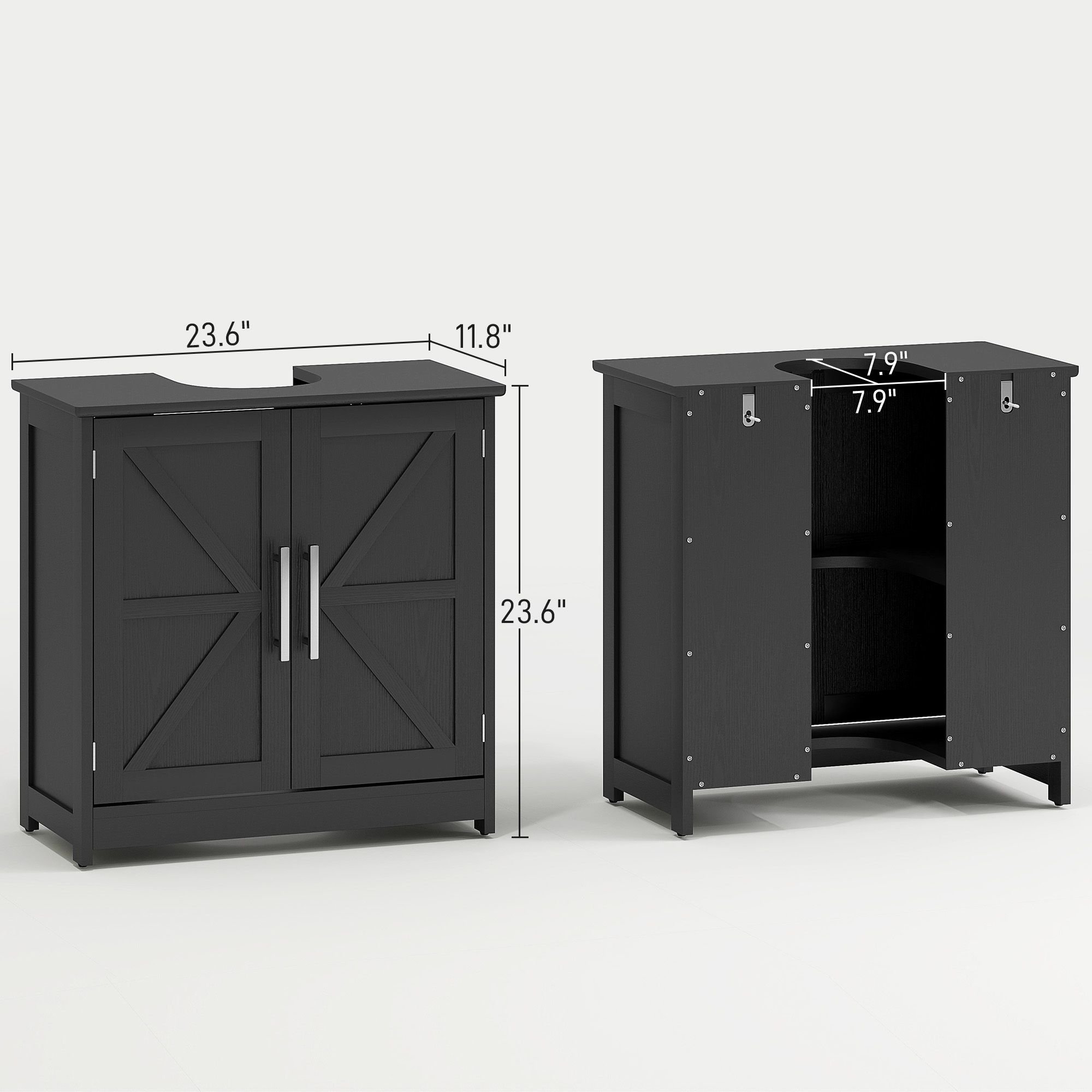 1.- Farmhouse Charm: This under sink cabinet brings cozy, rustic vibes to your bathroom. The charming barn doors and stylish black metal handles create a warm look that perfectly blends farmhouse elegance with everyday functionality