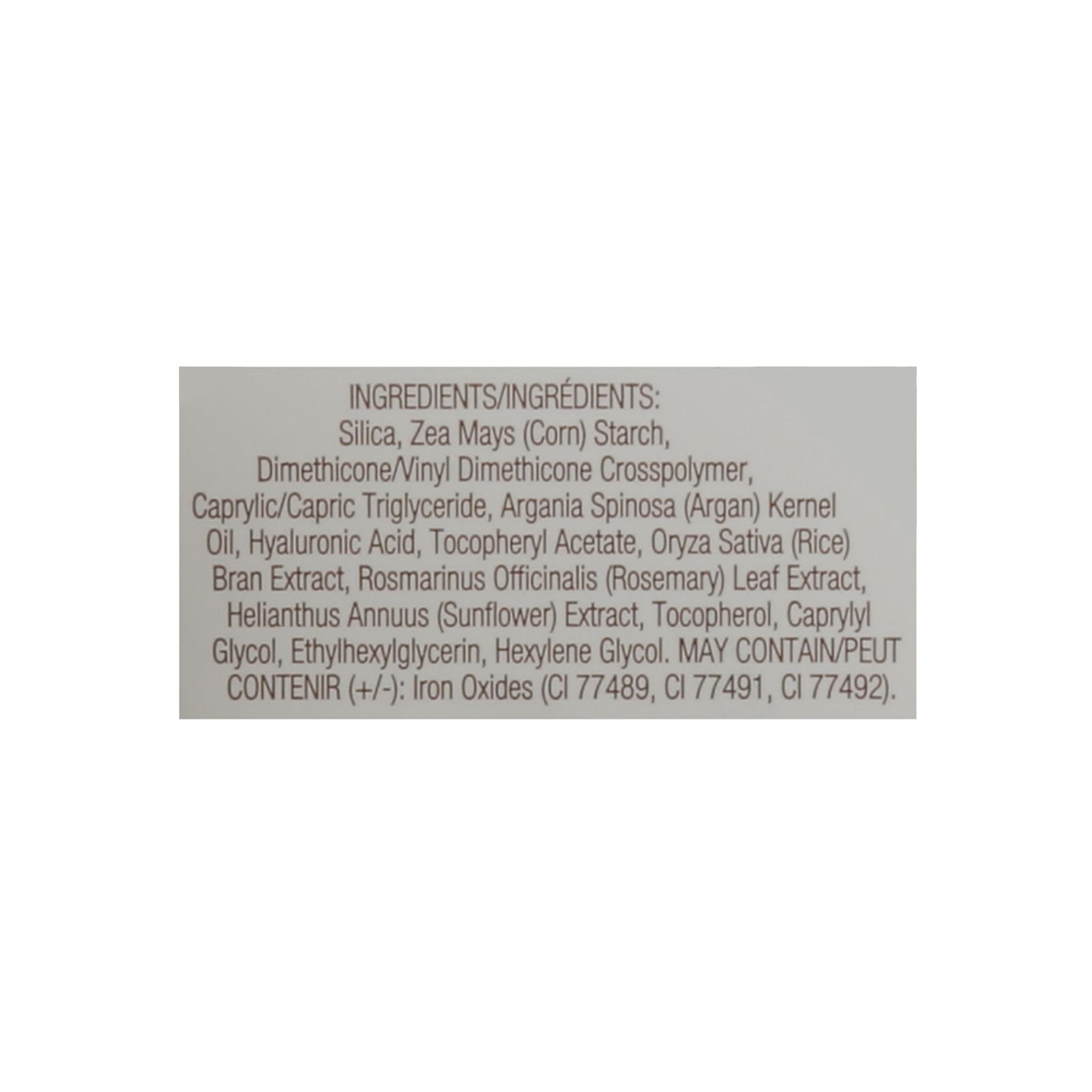ingredients : silica;zea mays (corn) starch;dimethicone/vinyl dimethicone crosspolymer;caprylic/capric triglyceride;argania spinosa (argan) kernel oil;hyaluronic acid;tocopheryl acetate;oryza sativa (rice) bran extract;rosmarinus officinalis (rosemary) leaf extract;helianthus annuus (sunflower) extract;tocopherol;caprylyl glycol;ethylhexylglycerin;hexylene glycol