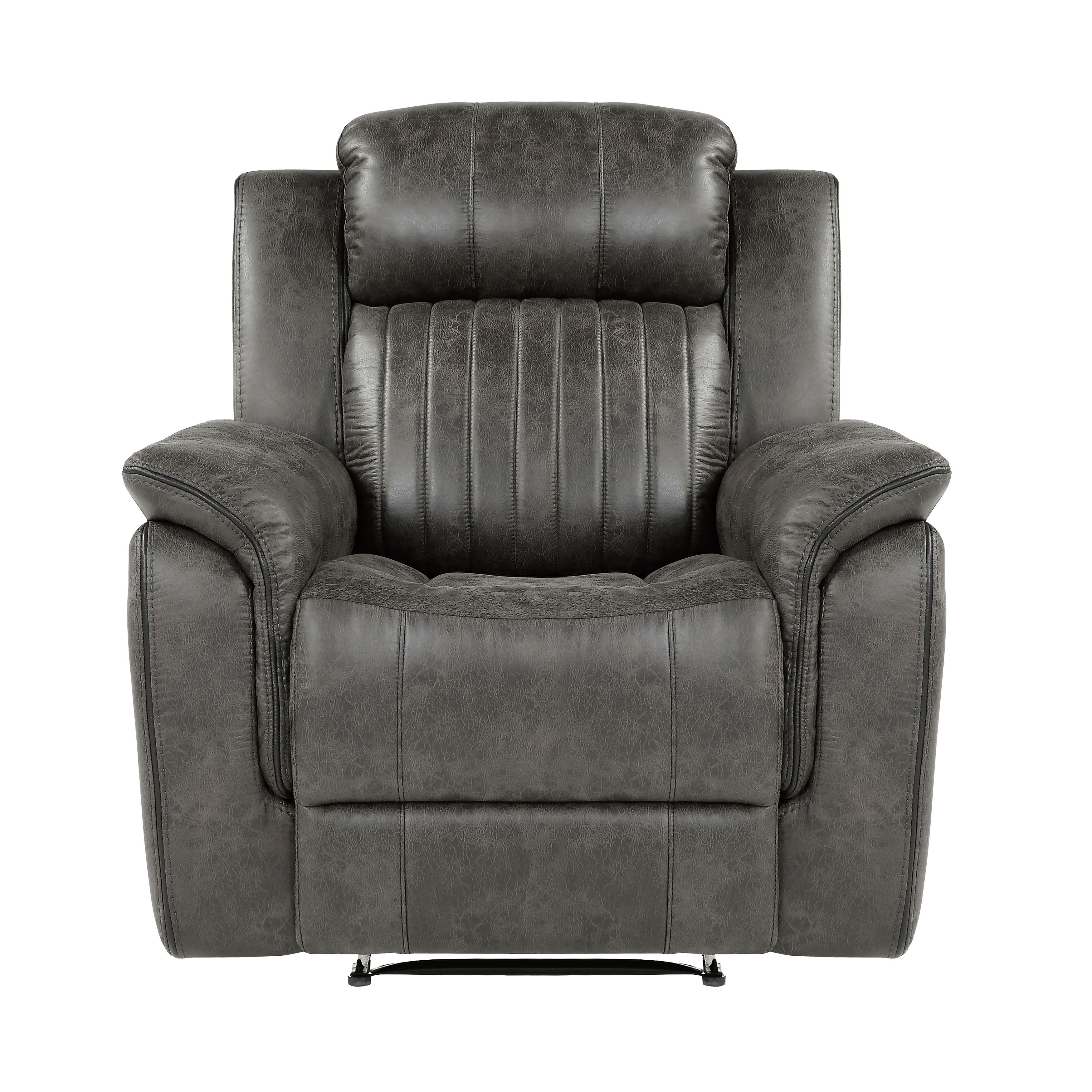 The design of the Centeroak Collection provides a platform for your relaxing downtime. From the classic transitional style to the versatile neutral color of the brown-ish gray polished microfiber fabric covering, this chair is the perfect addition to your living room. Plush seating features vertical tufting, pillow-top arms, enhanced by the reclining mechanism which is engaged with a pull of the side mounted tab, taking you from seated to prone in an easy motion.PRODUCT DIMENSIONS:Overall Dimension: 39.5" x 38" x 41"HSeat Width: 19.5"Seat Depth: 21"Seat Height: 20.5"Arm height: 26"Fully reclined length: 65.5"Fully reclined height: 32"Doorway width: 26"Listing Includes: One Reclining Chair Only.Sofa and Loveseat: Not included.Simple Assembly Require.
